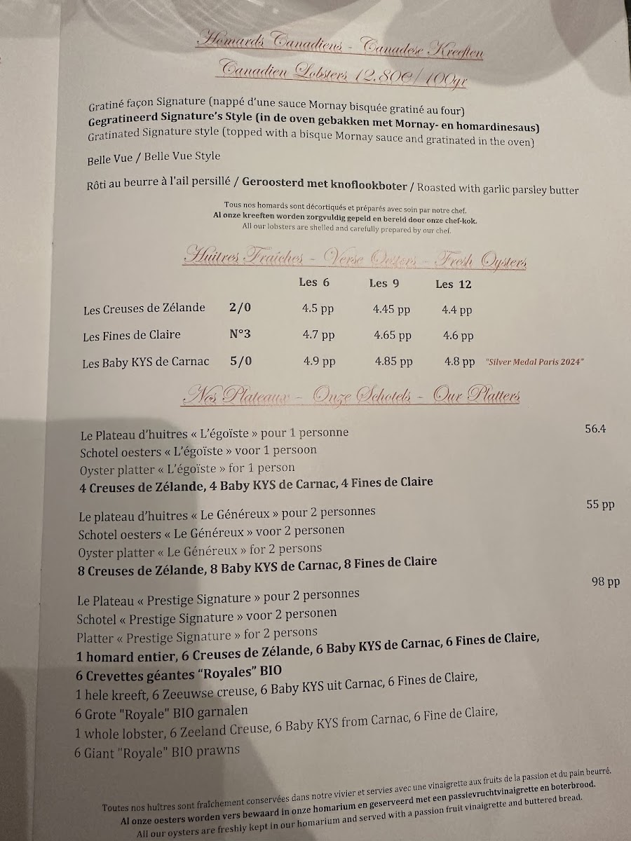 1 homard entier, 6 Creuses de Zélande, 6 Baby KYS de Carnac, 6 Fines de Claire, 6 Crevettes géantes "Royales" BIO