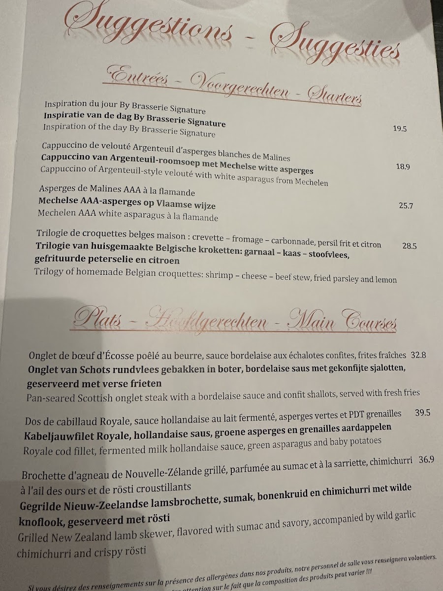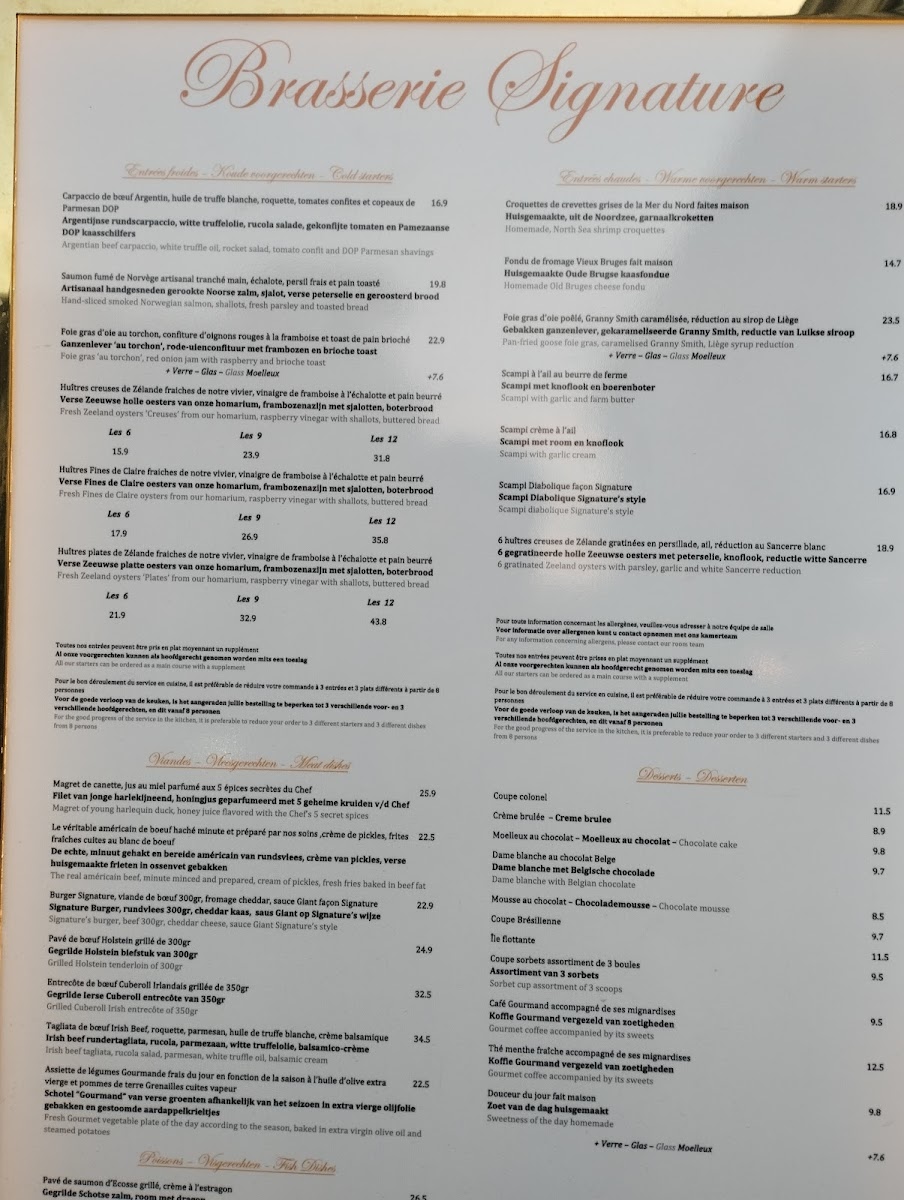 The menu at Brasserie Signature Menu is a delightful journey through classic Belgian and European flavors with a modern twist. Nestled in the heart of Etterbeek, this charming spot offers an array of dishes that beautifully showcase the region’s rich culinary tradition. From fresh seafood to expertly prepared meats, each plate is crafted with the finest ingredients, ensuring a memorable dining experience. Whether you're craving a comforting stew or something lighter, the diverse offerings cater to all tastes. Pair your meal with a selection of wines or artisanal beers, making your meal at Brasserie Signature even more enjoyable.
